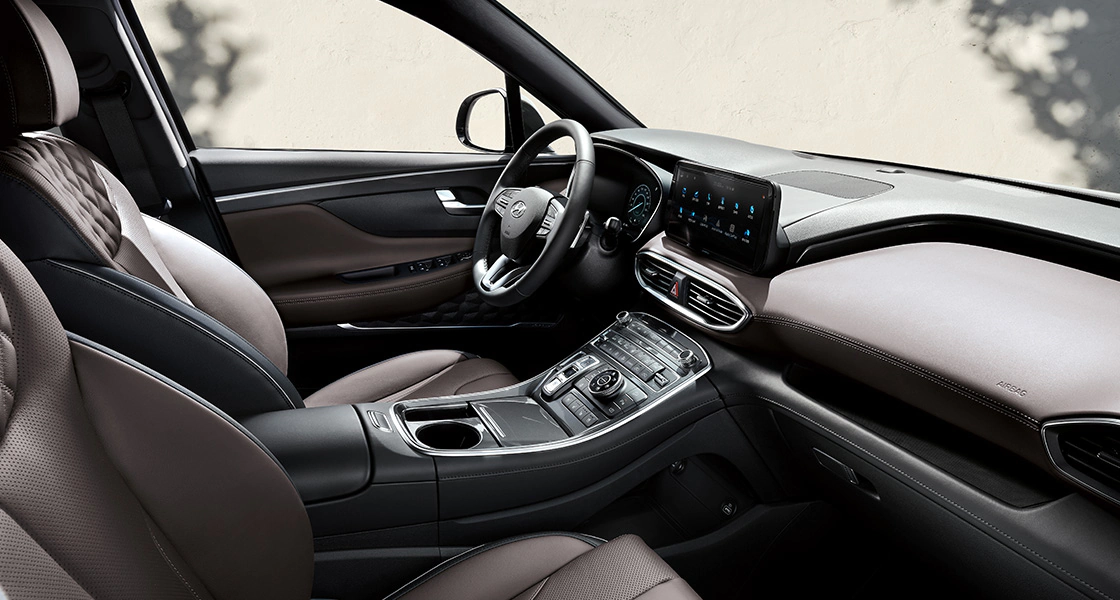 싼타페는 중형 SUV 차량으로 아래에 나타낸 차량 내부 사진을 보면 앞서 살펴봤던 소형 SUV에 비해서 확연하게 차량 사이즈가 큰 걸 볼 수 있다. 내부 디자인은 투싼에 비해서 투박한 느낌이 없지는 않지만 그런 만큼 여유 있게 탁 트인 내부가 시원한 느낌을 준다. 차량은 크게 두 종류가 있으며 각각의 배기량은 2,151 cc, 2,497 cc를 보유하고 있다. 최대 출력은 202 PS/ 3,800 rpm, 281 PS/ 5,800 rpm이었다.