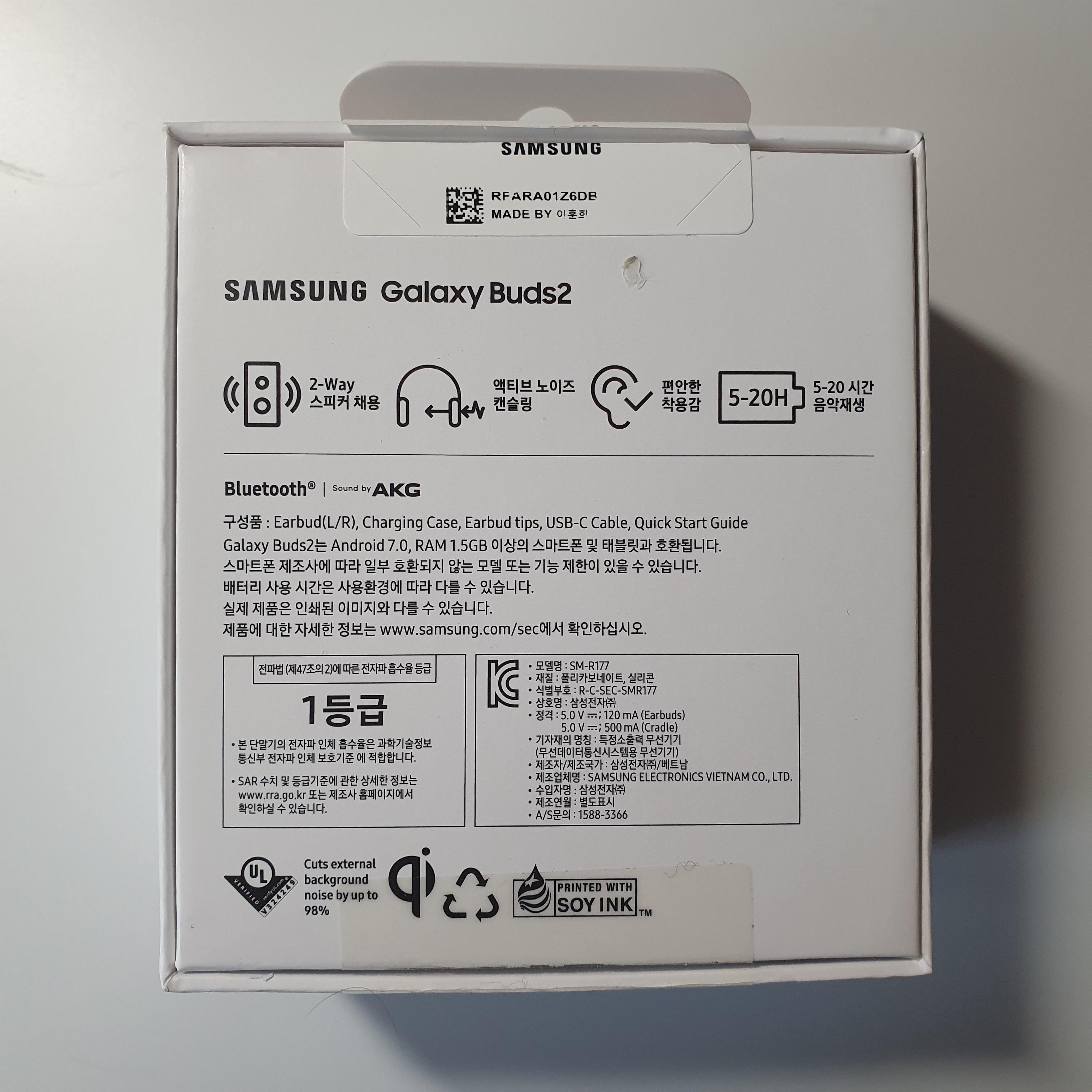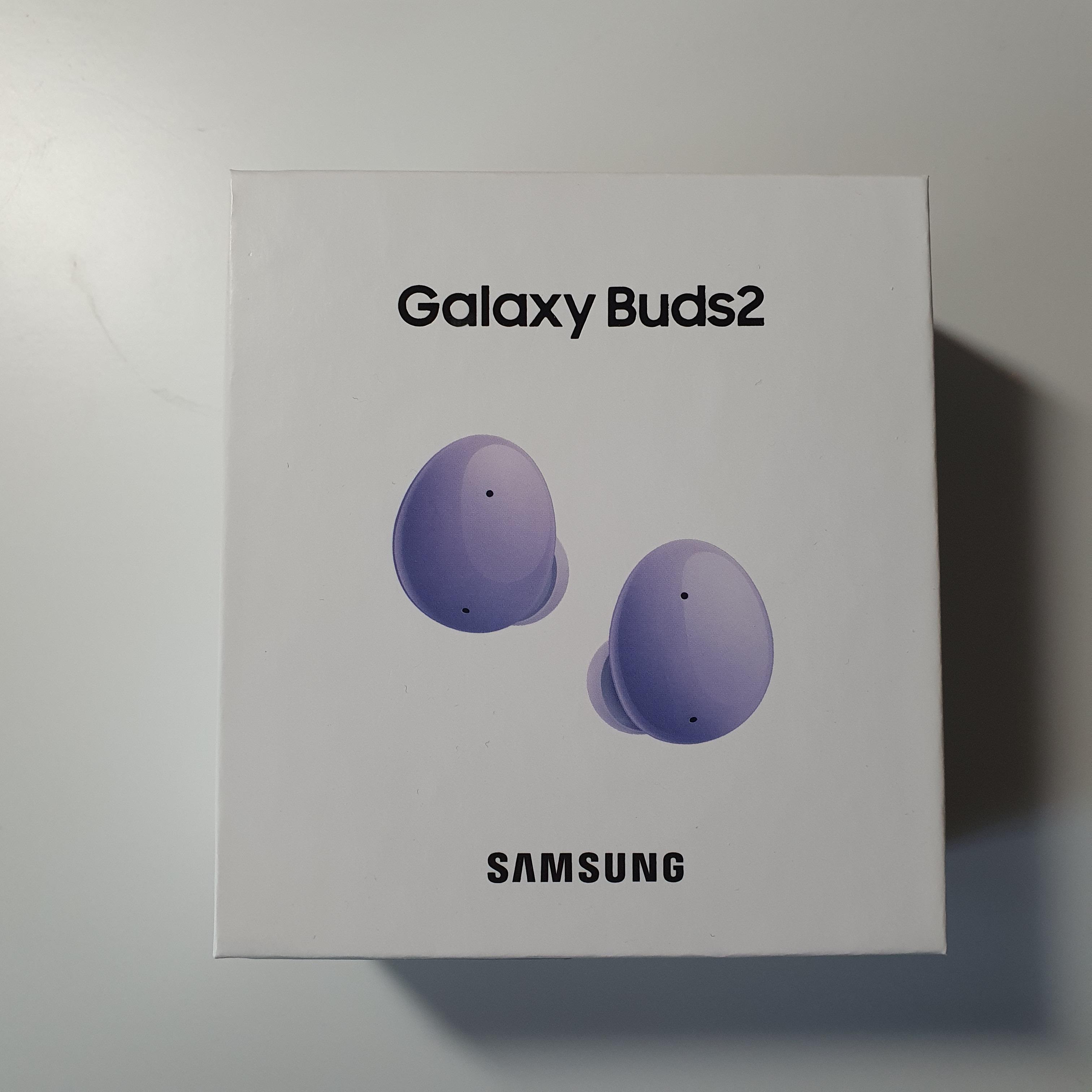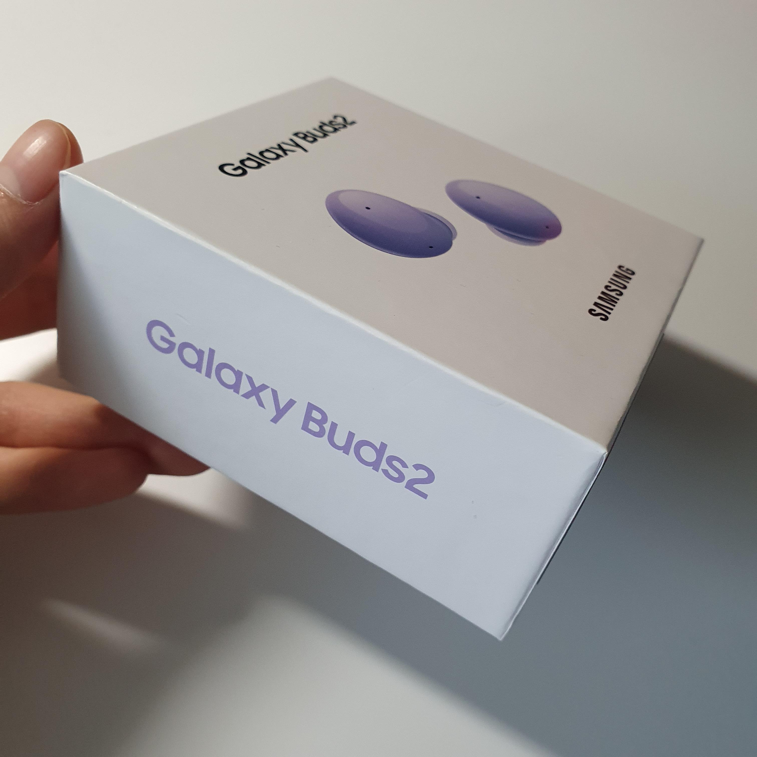 위의 사진에서 보시는 것처럼 갤럭시 버즈2의 박스 외관에 라벤더 색상의 버즈를 미리 볼 수 있도록 디자인해놓을 것을 확인하실 수 있어요.