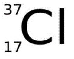 원소기호의 왼쪽 아래쪽에 표시하는 숫자는 양성자의 숫자를 나타내며, 양성자의 숫자와 전자의 숫자는 같기 때문에 양성자와 전자의 개수는 17개가 되며, 원소기호의 왼쪽 위쪽에 표시한 숫자는 양성자와 중성자 개수의 합을 나타내기 때문에 중성자의 개수는 20이 된다.